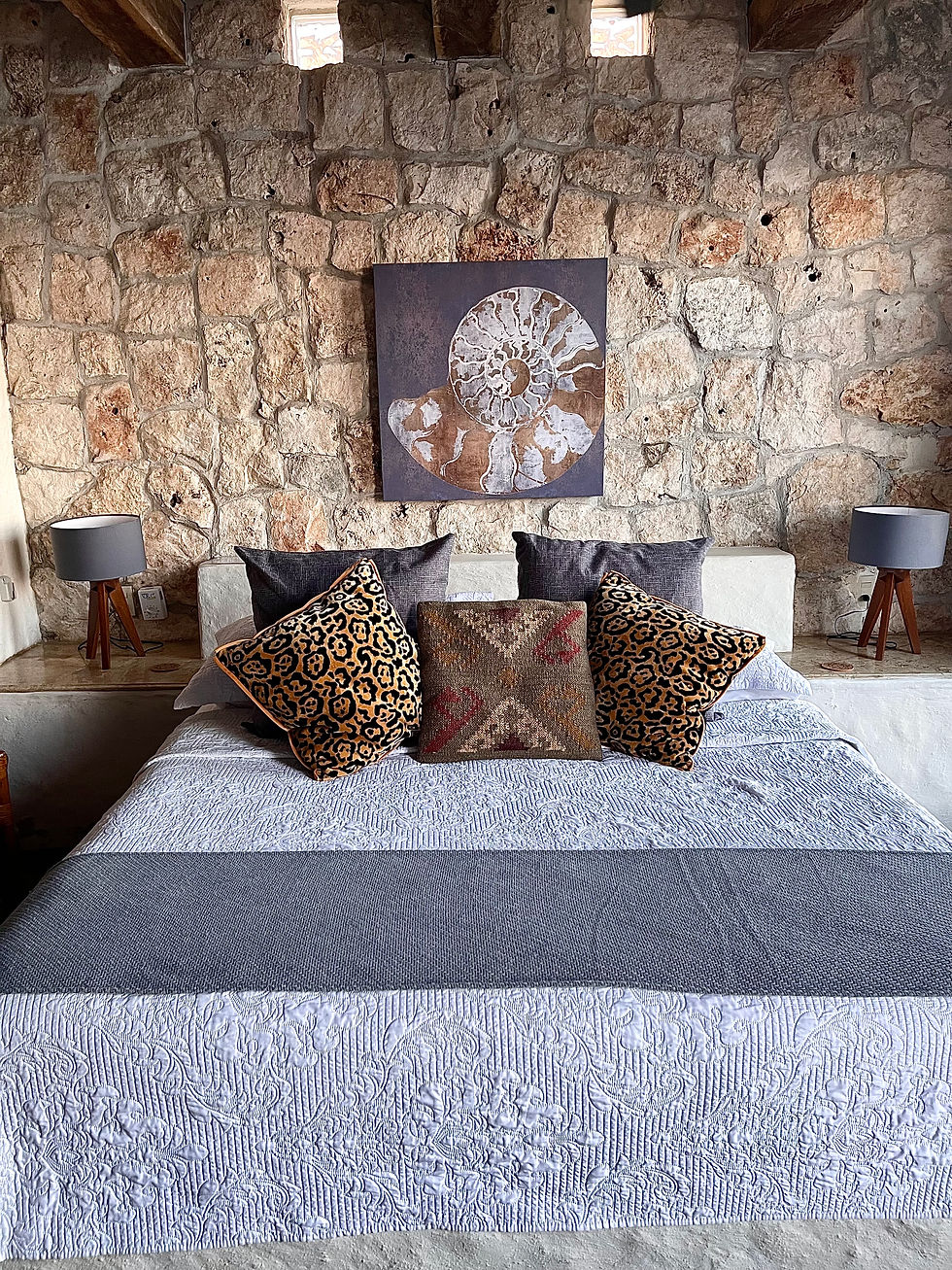 Towering 15 foot ceilings adorned by a Morrocan-style chandelier compliment this charming ocean front room designed as the writing retreat of Maji Azul. The tiny loft features a daybed, bookcase and writing desk. Perched high above the Caribbean with three arched windows, it is the perfect space for inspiration. Beautiful sea side views greet you from every window. Below rests a Morrocan style king-size bed and antique Chinese amoire. Amenities include a garden shower, pressurized water system, flat screen smart TV, wifi, , A/C, ceiling fan, balcony with hammock, blowdryer, fine linens and a luxurious pillow top mattress.